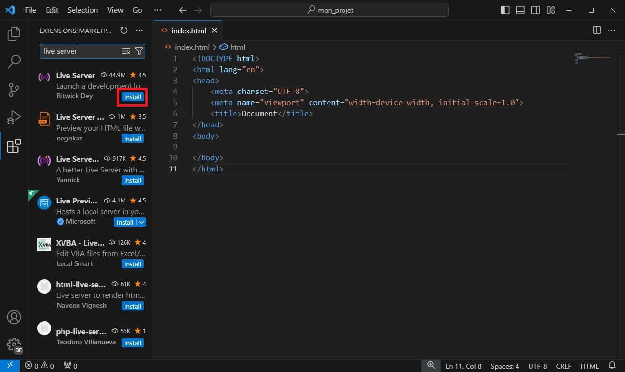 et dans la barre de recherche des extensions, il va falloir chercher "Live Server" puis cliquer sur son bouton "Install"