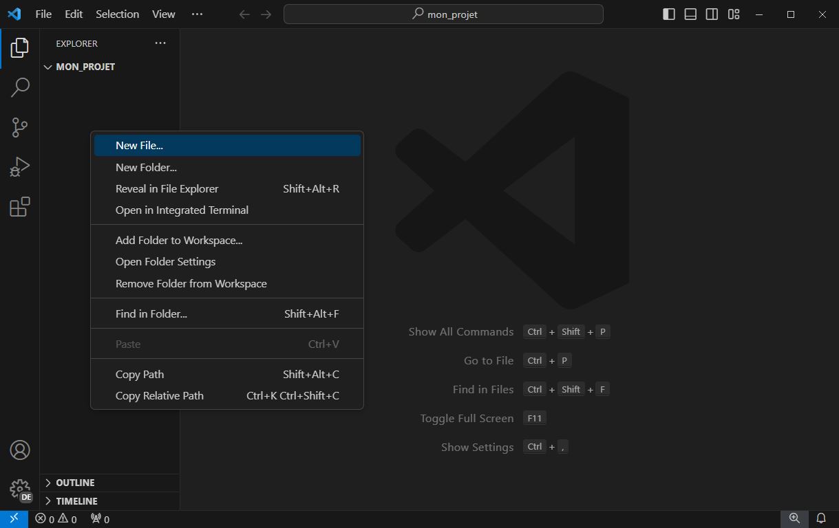 Maintenant vous pouvez ouvrir votre projet avec File > Open Folder... et ouvrir le dossier du projet (attention à ce que ce ne soit pas le dossier parent de tous les projets)